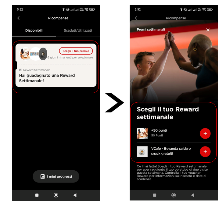 Alternativ klicke im Abschnitt 'Prämien' der Startseite der Virgin Active Italia App auf 'Meine Fortschritte prüfen' unter 'Wöchentliche Prämien' und klicke auf die verfügbare Belohnung (2)